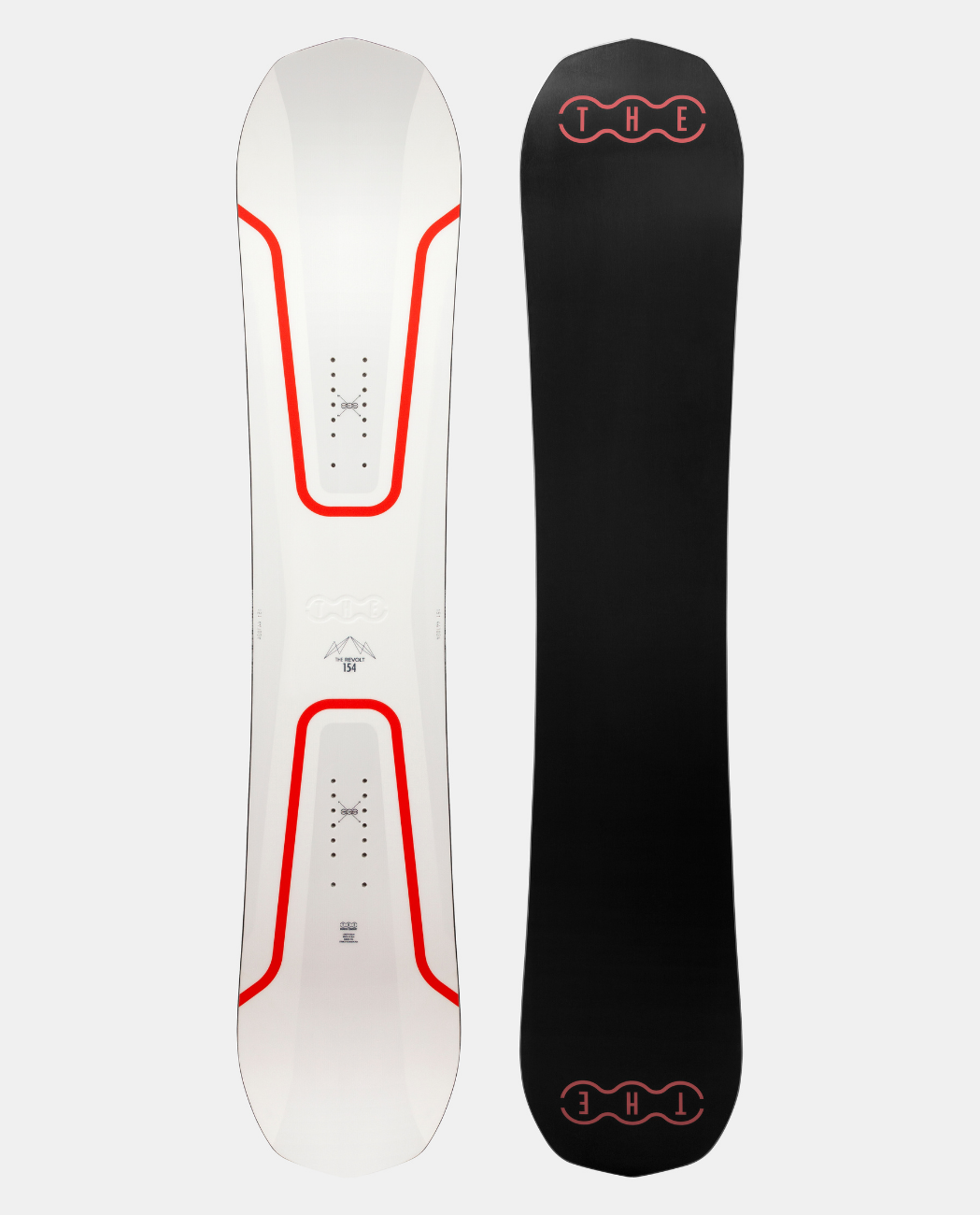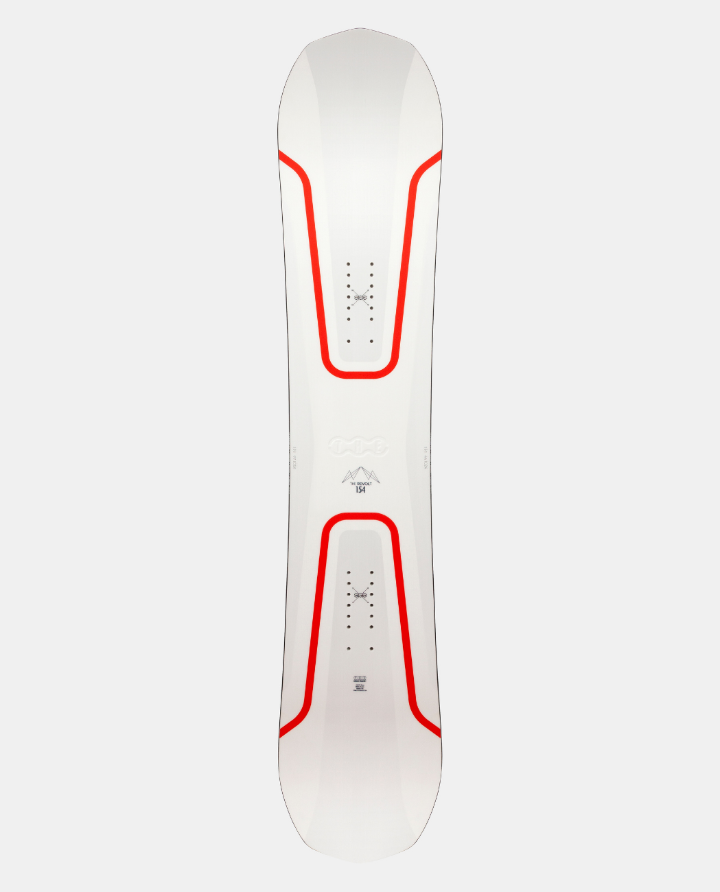THE Revolt is flat between the bindings with camber starting underneath the binding areas for stability, playfulness and loads of pop. Its nose and tail rise early for forgiveness and easy turns and tricks. The shape of THE Revolt gives it great all round versatility for fun turns and freestyle moves.