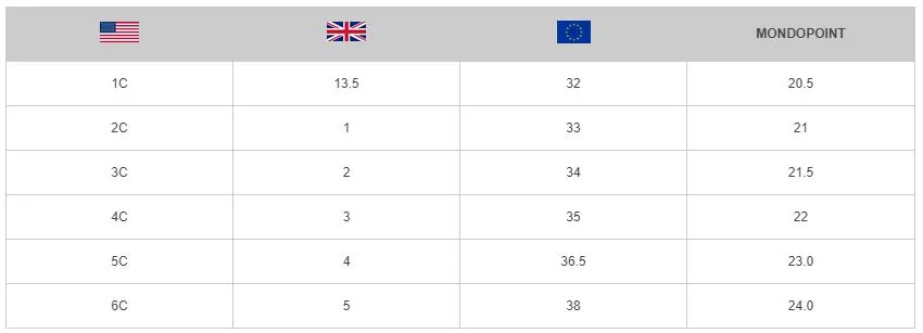 We geven de Europese schoenmaten weer. maar deze kan variëren per merk. Het beste is om je voet op te meten in centimeters. de lengte van je schoen in cm is gelijk aan de mondopoint maat. Je meet de lengte het beste door je hak tegen een hard iets (de muur) te zetten en rechtop te gaan staan. De maattabel met mondopoint maten voor deze schoen vind je als afbeelding terug bij de productafbeeldingen.